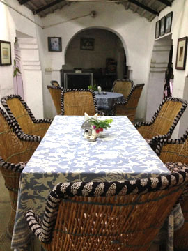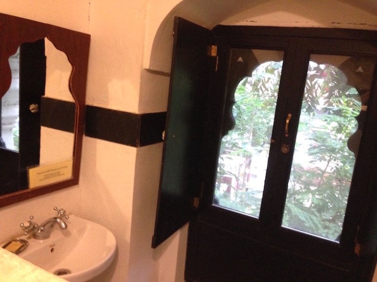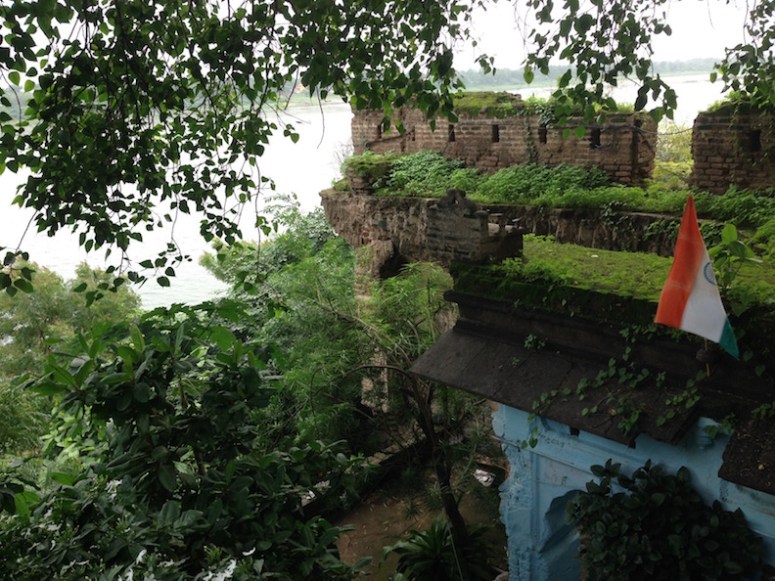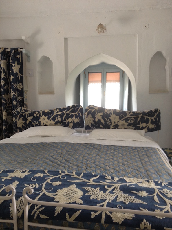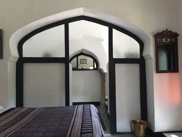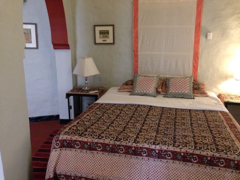 RETREAT OFF-CAMPUS : These 6 exclusive authentic heritage rooms are hidden inside the actual walls of the Gatehouse to Maheshvar Fort’s Palace, walk 3 minutes along the Fort wall to SwAr Ashram, (part of the Fort) located on Maheshvar Ghat. Royal heritage furnishings in lodging built into the beautifully restored Palace Gatehouse. (there are only 6 rooms of this quality & one of those is a very large super deluxe room with double rate of occupancy.)
