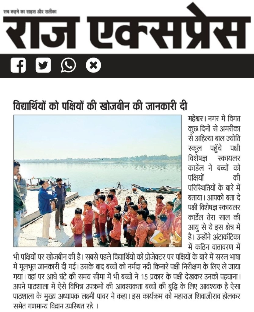 Skyler made a splash in the Raj Express newspaper when he presented a local Bird ppt for the regional Maharaja‘s (Indian Royalty) Montessori school and then took 30 children on a riverfront Birdwalk with him. Skyler then literally blazed a trail, curating Birdwalk experiences for the senior Maharaj himself and his Family’s elite guests.